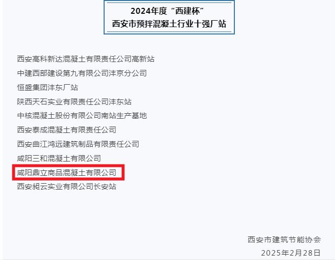 祝賀我公司榮獲2024年度“西建杯” 西安市預(yù)拌混凝土行業(yè)十強(qiáng)廠站榮譽(yù)稱(chēng)號(hào)